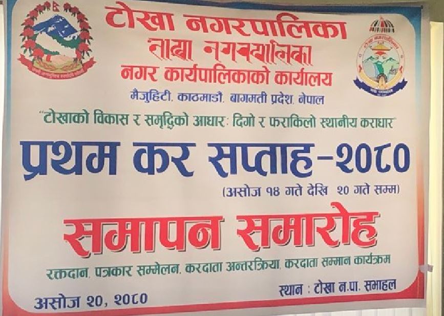 टोखा नगरपालिका को सभा हल मा सम्पन्न समापन समाहरोह मा आर्थिक वर्ष २०७९/८० मा सबै भन्दा बढी कर तिर्ने टोखा नगरपालिकाका करदाताहरु लाइ सम्मान गरिएको थियो ।कर दाताहरु लाइ प्रमुख अतिथि जिल्ला समन्वय समितिका प्रमुख सन्तोष वुढाथोकी, अतिथिहरु जिल्ला प्रशासन कार्यालयका सहायक प्रमुख जिल्ला अधिकारी रविन्द्र आचार्य,जिल्ला समन्वय समितिका राजकुमार बिडारी, टोखाका नगर प्रमुख र उपप्रमुखबाट सम्मानपत्र का साथै प्रमुख प्रशासकिय अधिकृतबाट दोसल्ला ओडाएर सम्मान गरिएको थियो ।