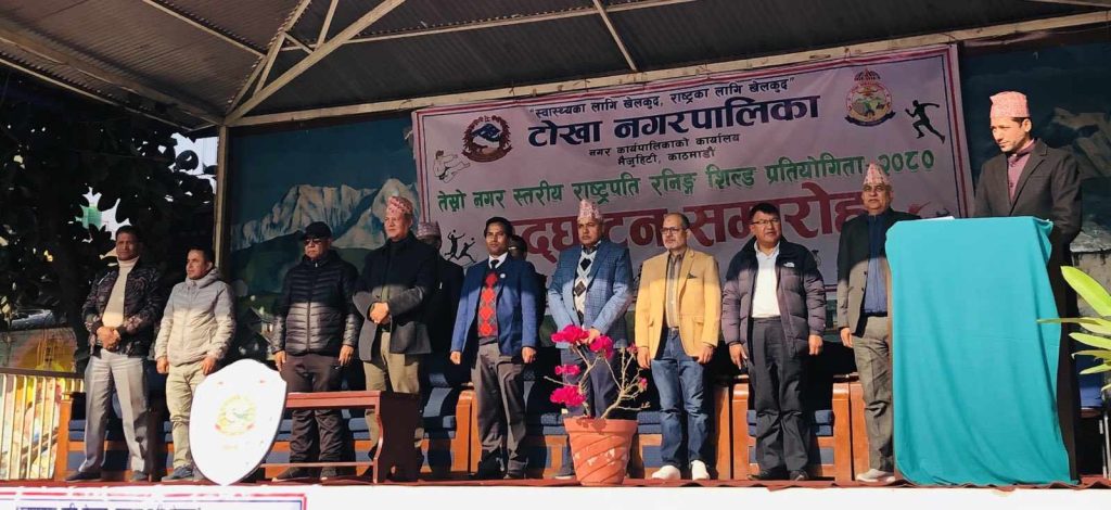 स्वास्थ्यको लागि खेलकुद राष्ट्रका लागि खेलकुद भन्ने मूल नारा का साथ् टोखामा तेस्रो नगरस्तरीय राष्ट्रपति रनिङ्ग शिल्ड प्रतियोगिता–२०८० को शुरुवात भएको छ । टोखा नगरपालिकाको आयोजनामा पांच दिन सम्म चल्ने प्रतियोगिताको आज फ्लोरोसेन्ट माध्यमिक विद्यालय,टोखा ८ को प्रांगणमा उद्घाटन भएको हो ।
