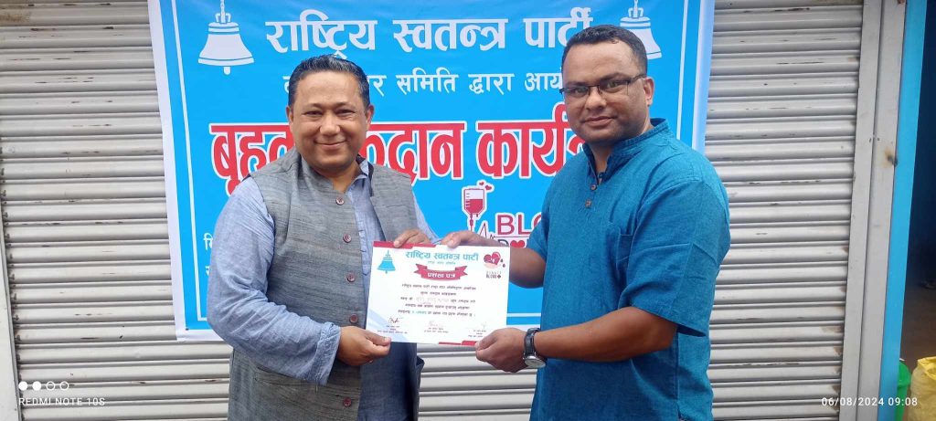 राष्ट्रिय स्वतन्त्र पार्टी टोखा नगर कमिटिले आज बृह्त रक्तदान कार्यक्रमको आयोजना गरेको थियो । आज बिहान ग्राण्डी अस्पताल नजिकै नगर समितिको कार्यालय प्राङगणमा भएको कायृक्रममा ५० जना रक्तदाताले रक्तदान गरेको नगर सभापति सुर्य प्रसाद काफ्लेले बताएका छन् ।