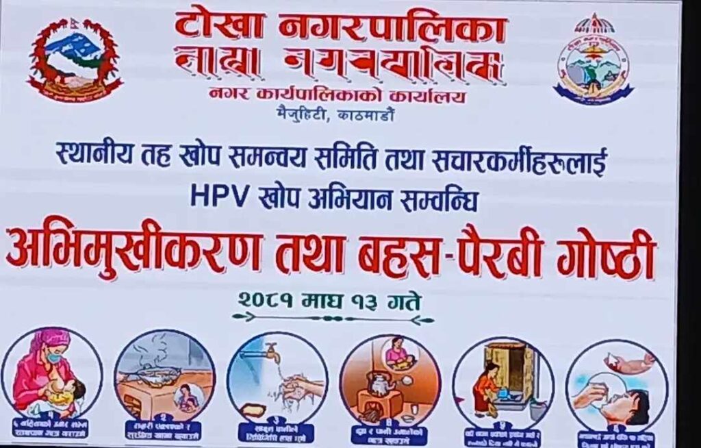 एच.पि. भि.खोप अभियान अन्तर्गत आउँदो माघ २२ गते देखि फाल्गुण ६ गते सम्म नगरका सबै विध्यालयहरुमा खोप कार्यक्रम सन्चालन हुदै छ ।टोखा नगरपालिका लगाएत देशै भरि नै संचालन हुने विद्यालय केन्द्रित खोप केन्द्रहरुबाट संचालन हुने यो अभियानमा १०-१४ वर्ष उमेर समुहका किशोरीहरु तथा ६- १० कक्षामा अध्ययनरत छात्राहरुलाइ खोप सेवा प्रदान गरिदै छ ।