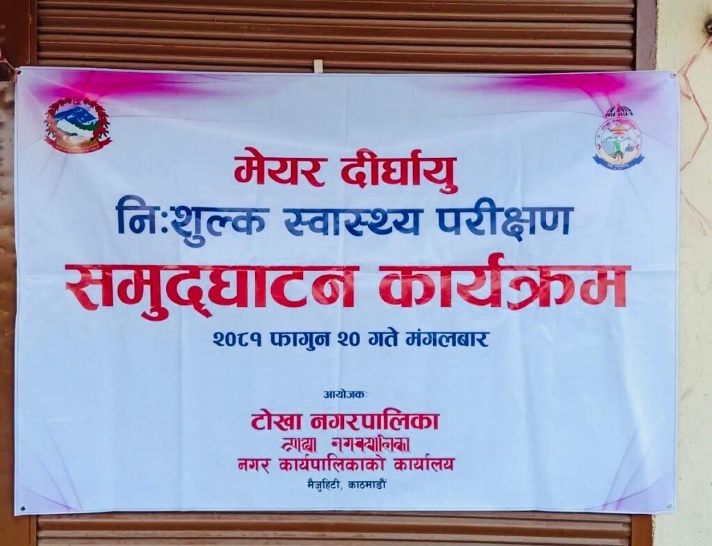 नगरवासी जेष्ठ नागरीकका लागी निशुल्क स्वास्थ्य परिक्षण सेवा प्रदान गर्न टोखा नगरपालिकाले यो बर्ष पनि मेयर दिर्घायु निःशुल्क स्वास्थ्य परीक्षण कार्यक्रमको शुभारम्भ गरेको छ । टोखा ११ स्थित आधारभूत स्वास्थ्य सेवा केन्द्रबाट सेवा प्रदान हुने गरि नगर प्रमुख प्रकाश अधिकारीले आज कार्यक्रमको उद्घाटन गर्नु भएको हो ।