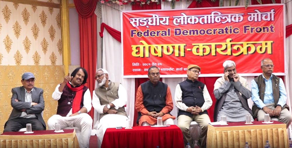 तराई–मधेस केन्द्रित सात राजनीतिक दलले सङ्घीय लोकतान्त्रिक मोर्चा घोषणा गरेका छन्। मोर्चाको उद्देश्य संविधान संशोधन, सङ्घीय लोकतान्त्रिक गणतन्त्रको रक्षा, र सुशासन प्रवर्द्धन गर्नु रहेको छ।
